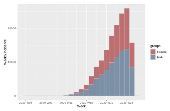 Figure 8 shows a graph of the weekly incidence of COVID-19 among the population from all the territory. Bins in red represent the incidence of females, while bins in blue represent the incidence of males. With this graph it is possible to observe the behavior of the incidence of the disease throughout the weeks and to make a comparison of this incidence between both sexes.