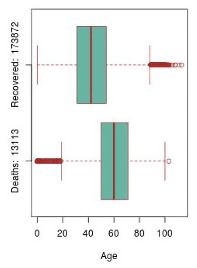 Figure 9 shows two boxplots, one referring to the number of patients recovered from COVID-19 and the other to the number of cases of patients who died due to this disease. With these graphs it is possible to make a direct comparison between the total number of patients who are recovered against the deceased, taking into account the age ranges of the patients. In addition, it is also possible to compare the distribution of these numbers, the mean, the quartiles, and those outliers that have occurred.