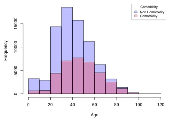 The comorbidity overlapped histogram is a visualization and analysis tool that allows to compare the population with a positive, negative or uncertain result of SARS-CoV-2 that present comorbidities and those who do not present, based on the age. With this graph, a risk assessment can be made by analyzing the frequency with which comorbidities occurred or not within the selected population. This frequency is based on age ranges. Therefore, it is possible to have an overview of the frequency with which comorbidities occur or not, in relation to people who have COVID-19 and those who do not.