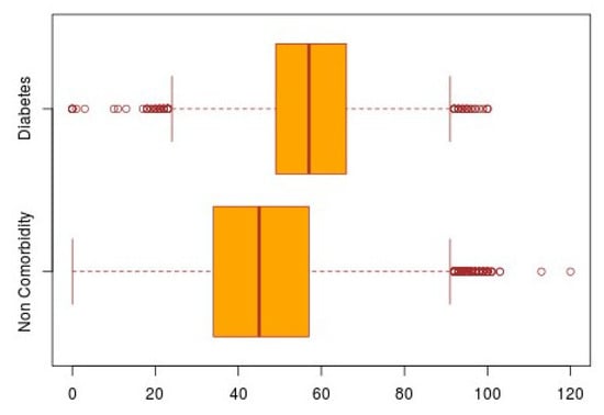 An example of a double boxplot is shown in Figure 11. For the construction of this graph, the same parameters from the previous overlapped histogram are applied. The boxes are developed based on the age of the subjects. The red lines that are in the middle of the boxes represent the median value, which is to say, the median age of the subjects, while the vertical edges represent the lower and upper quartiles. The vertical short lines that are at the ends of the projecting lines of the boxes represent the minimum and maximum age presented by the subjects. The small circles that exceed the maximum and minimum limits represent the outliers, which are the atypical samples of the subjects, that is, those rare cases in which the subjects with presence of comorbidities had ages that did not fall within the age range of the population.