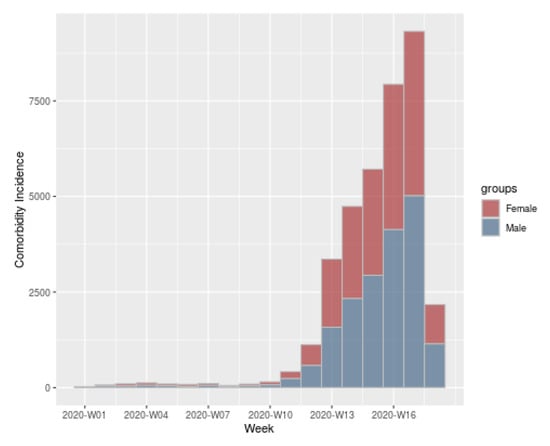 In Figure 12 is shown an example of an histogram representing the comorbidity incidence of the same sample as the used in the previous graphs. In this graph it is possible to observe the incidence among the weeks of COVID-19 presented by females (shown in red) and males (shown in blue) with at least one comorbidity.