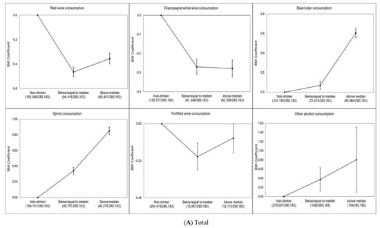 Previous cohort studies also found similar findings regarding the association between the consumption of different types of alcoholic drinks and BMI [,,]. In a previous study of Sayon-Orea et al., beer and spirits consumption (≥7 drinks/week) was associated with a 119 g/year higher average yearly weight gain, whereas no association was found between wine consumption and overweight/obesity []. Two large-scale American cohorts, namely the Nurses’ Health Study (n = 121,700) and Health Professionals Follow Up Study (n = 51,529) [], also found positive associations between BMI and the consumption of spirits. In addition to having a higher BMI, a direct association was found between waist circumference and high consumption of beer and spirits, while the inverse association was found between wine consumption and waist circumference in the prospective Copenhagen City Heart Study []. In a cross-sectional English study (n = 8864), beer and spirit consumption significantly increased the odds of obesity relative to wine consumption []. In contrast to these studies, irrespective of the type of drink, positive associations between alcohol consumption and general adiposity (BMI and body fat percentage) and to a greater extent, central adiposity (waist to hip ratio and waist circumference) has also been shown [].