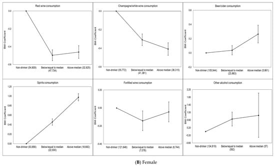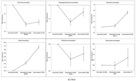 (A–C) Multivariable-adjusted dose–response association of alcoholic beverage types and BMI in the UK Biobank. The BMI coefficient displays the mean difference between the reference category (no consumption in last week) and the other consumption categories. The model is adjusted for age, sex, overall alcohol consumption, smoking status, sleep (h/night), sedentary behavior (h/day), illness (major cardiovascular disease or cancer), physical activity, Townsend deprivation index and daily fruit and vegetable consumption for the total sample. The model is adjusted for age, overall alcohol consumption, smoking status, sleep (h/night), sedentary behavior (h/day), illness (major cardiovascular disease or cancer), physical activity, Townsend deprivation index and daily fruit and vegetable consumption for each sex. Individuals who did not report consumption of the alcoholic beverage type in the week prior to measurement were considered non-drinkers. Low consumption was defined as less than or equal to the median for the alcoholic beverage type, and high consumption was defined as greater than the median for the alcoholic beverage type. The number of participants in each alcohol consumption category (i.e., non-drinker, low or high) included in the analysis is shown below each figure.