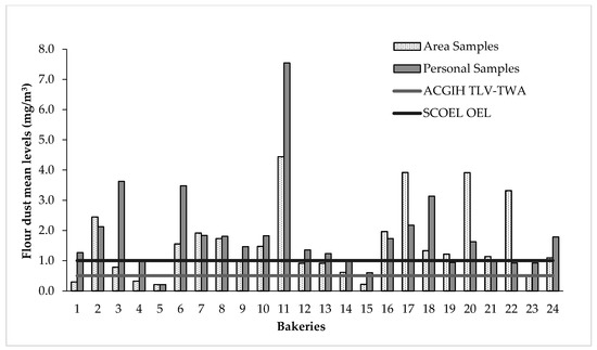 Mean flour dust levels in the 24 Italian bakeries. (ACGIH TLV-TWA, American Conference of Governmental Industrial Hygienist Threshold Limit Value-Time-Weighted Average; SCOEL OEL, Scientific Committee on Occupational Exposure Limits Occupational Exposure Limit).