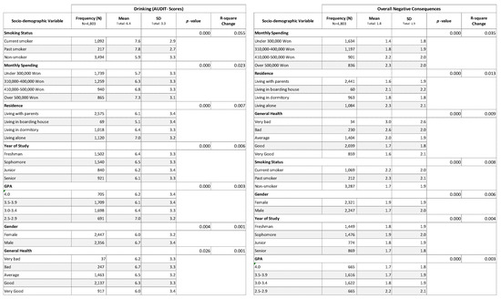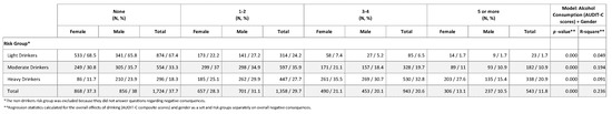 3.1. Associations between Respondent Characteristics Variables, Alcohol Consumption and Overall Negative Consequences