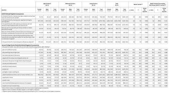 The third step of data analysis was to (a) assess the effects of the independent gender (dichotomous) variable on dependent variable of overall alcohol consumption (continuous, but represented descriptively by the different risk groups of light, moderate and heavy drinkers) and (b) the combined effects of gender and alcohol consumption on total negative consequences (continuous, but represented descriptively by the ranges of 0, 1–2, 3–4 and 5 or more). Multivariate linear regression tests were performed with gender, AUDIT-C composite scores and total negative consequences variables.