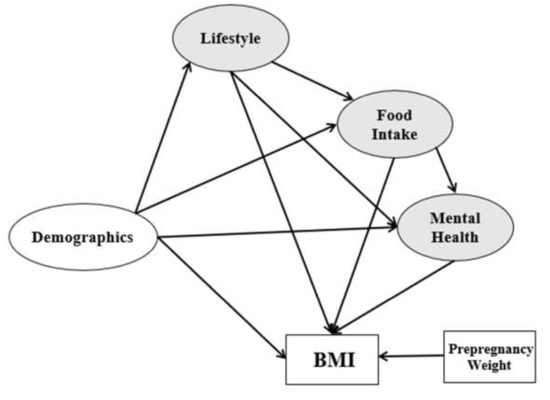 The sociodemographic and economic situation are among the main factors that are significant for postpartum women obesity, which is confirmed from previous studies [22,23,24]. Age, education, income, and job experience are the most familiar variables that research scholars are concerned with. In our study, we considered the combination of them in one latent variable as the primary independent variable. Some researchers have found that physical function, sleep quality, average working hours per day, and smoking habits were affecting postpartum obesity. However, there is a lack of studies related to the impact of the average use of screen time on postpartum obesity. These factors represent their lifestyle. In most previous studies regarding postpartum obesity modelling, the effect of those factors on BMI was considered, separately. The factors are related to each other and could be considered as one of the groups of lifestyle variables and are defined as a latent variable. The indicators of lifestyle latent variable (research variable) depend on the participant’s characteristics. The measurement of the variable is defined based on the postpartum lifestyle.