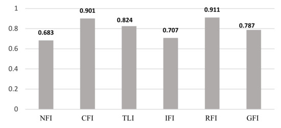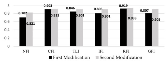 Based on Figure 2, from the four indices, four of them (NFI, TLI, IFI, and GFI) obtain less than 0.9. Therefore, model fitting is not accepted for the raw data. In order to solve this issue, modification indices are used. Modification indices are applied to create alternative models to improve fitting. But, they must be supplemented with sufficient reasons based on theoretical justification [78]. In addition, Silvia et al. [79] suggested that it should be minimized to avoid over-fitting in the modeling analysis. We applied the times’ modification indices. Figure 3 shows the model fitting analysis after we applied the first and the second modification indices in our modeling process.