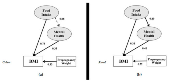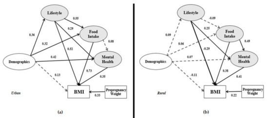 With the SEM technique, the structural model serves to recognize the hypothesized relationships between the variables that show the links to the presumed model’s conception. Figure 4 presents urban and rural structural models.
