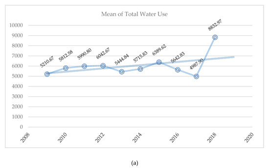 Table 5 reveals the summary statistics for the variables used in the empirical research. We noticed that total water use registered the highest mean values, whereas total waste showed the lowest mean values. Figure 1 plots the annual means of total water use, total waste, and total energy consumption. As long as a small number of companies reported the data for the last two years, 2019 and 2020 are not covered in Figure 1. An increasing trendline of total water use and total energy consumption was noticed, and this was facilitated by the fact that in order to produce and power the related equipment, data hubs, or facilities requirements, a huge amount of electricity is needed. Therefore, the energy footprint of the Information Technology industry is projected to exhaust around 7% of global electricity [105]. Additionally, the International Energy Agency [106] advised that deprived of novel strategies, the energy spent by information and communications tools along with consumer electronics will double by 2022 and upsurge threefold by 2030 to 1700 terawatt hours, which will threaten the diligence of raising energy security and lessen the emanation of greenhouse gases. However, with reference to total waste, a decreasing trendline occurred because many large tech corporations are leaders in environmental responsibility [107].