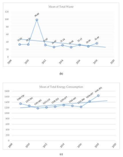 The annual means of (a) total water use, (b) total waste, and (c) total energy consumption. Source: Authors’ work.