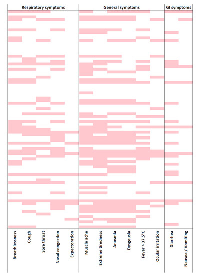 Heatmap of early symptoms reported by healthcare workers positive for SARS-CoV-2. Symptoms were grouped as respiratory, general, and gastrointestinal symptoms. Pink: symptom was present; white: symptom was absent. GI: gastro intestinal.
