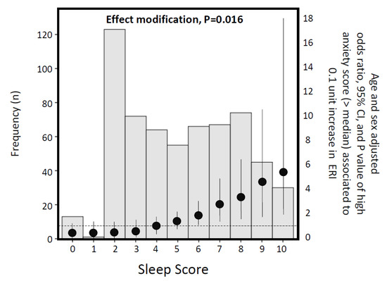 The effect modification by sleep quality (the potential effect modifier) on the relationship between ERI and PJ with anxiety and depression (both re-codified in binary terms, i.e., below/above the corresponding median values) was investigated by age and sex adjusted logistic regression analyses. In these analyses, data were expressed as odds ratio, 95% CI and p values. The odds ratios of having an anxiety and depression > median associated to 0.1 unit increase in ERI and 1.0 unit increase in PJ across predefined sleep quality values was investigated by the standard linear combination method. Data were analysed with the statistical package IBM/SPSS Statistics 23.0 (IBM, Armonk, NY, USA).