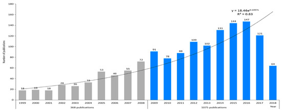 Based on our search strategy and on the inclusion and exclusion criteria, 1443 journal articles were retrieved in PubMed on the topic of climate change and infectious diseases from 1999 to 2018. The annual number of related articles grew exponentially from only 18 in 1999, to the maximum, 147 in 2017, as shown in Figure 1, where an exponential trend line could be added (the degree of fitting, R2, is 0.83). For the two periods, 1999–2008 and 2009–2018, there were 368 and 1075 journal articles involved, respectively, which were then subjected to a comparative analysis.