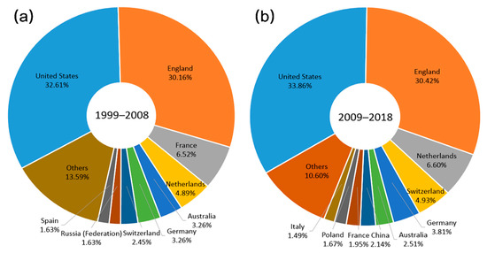 Publication places of journals publishing articles on climate change and infectious diseases. (a) Publication places of journals publishing relevant articles from 1999 to 2008; (b) publication places of journals publishing relevant articles from 2009 to 2018.