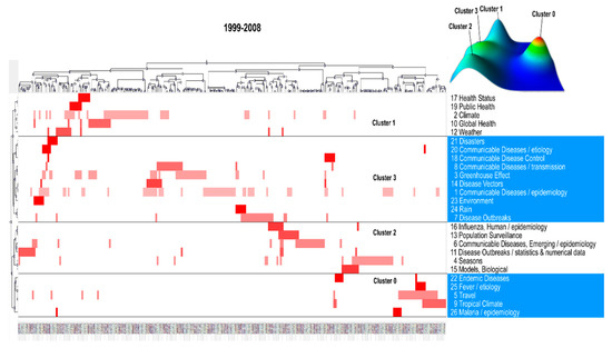 Mountain and matrix visualization of biclustering of highly-frequent major medical subject headings (MeSH)/subheading combination terms and articles on climate change and infectious diseases from 1999 to 2008.