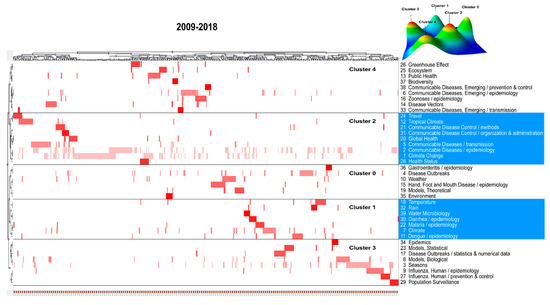 The high-frequency terms were classified into four clusters for the first decade and five for the second decade using the biclustering analysis, as presented in Figure 3 and Figure 4. These two figures also show the mountain and matrix visualization of these terms. In the mountain visualization, each 3D peak labeled by the cluster number contains a cluster of terms, of which the location on the plane, volume, height, and color are used to portray information about a cluster. The distance between two peaks on the plane reflects the relative similarity of two clusters. There is positive correlation between the peak’s height and the cluster’s internal similarity. The volume of a peak is positively correlated with the number of terms classified into a cluster. In addition, the peak’s color represents the internal standard deviation of a cluster’s terms. Blue represents a high internal standard deviation of the objects inside, whereas red represents a low internal standard deviation. In the matrix visualization, the high-frequency terms are listed on the right side. The number before each term represents its serial number (See Tables S2 and S3). The top and left hierarchical trees display the relationships among the included articles and those among the high-frequency terms, by which the themes of all of the clusters have been able to identify and summarize, and insights into the representative articles of each cluster could be attained as well. The hotspots of climate change and infectious diseases revealed by the cluster analysis of high-frequency terms during the two periods are presented in Table 2.