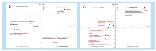 Strategic diagrams of hotspots in research output on climate change and infectious diseases from 1999 to 2008 and from 2009 to 2018. (a) Strategic diagrams of hotspot from 1999 to 2008; (b) strategic diagrams of hotspots from 2009 to 2018. € Q stands for quadrant. Clusters inside each strategic diagram refer to the clustering results shown in Table 2. The descriptions indicated by arrows are the hotspots of each cluster. The words in the red font represent the exclusive hotspot research topics in the first decade or the second decade.