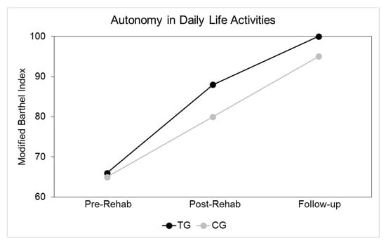 Median MBI-scores at admission, discharge and follow-up for control group (CG) (grey) and technological rehabilitation group (TG) (black).