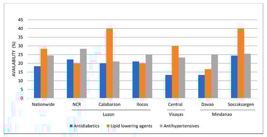 Figure 1 illustrates the availability of lowest-priced generics in public outlets across regions and pharmacological categories. Overall, antidiabetics had the lowest availability with 18.3%, especially in Central Visayas and Davao region. Lipid-lowering agents, on the other hand, had the highest availability with 28.3%, and the high availability of this category was evident in the Calabarzon and Soccsksargen regions. LPGs of antihypertensives had an availability of 24.5% in public outlets across the survey areas. However, it was still far below the ideal availability of 80% set by the WHO.