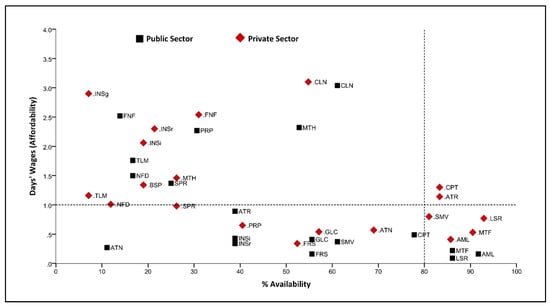 Comprehensive analysis of LPGs’ availability and affordability in public and private sector. AML, amlodipine; ATN, atenolol; ATR, atorvastatin; BSP, bisoprolol; CLN, clonidine; CPT, captopril; FNF, fenofibrate; FRS, furosemide; GLC, gliclazide; INSg, insulin glargine; INSi, insulin human isophane; INSr, insulin human regular; LSR, losartan; MTH, methyldopa; MTF, metformin; NFD, nifedipine; PRP, propranolol; SMV, simvastatin; SPR, spironolactone; TLM, telmisartan.