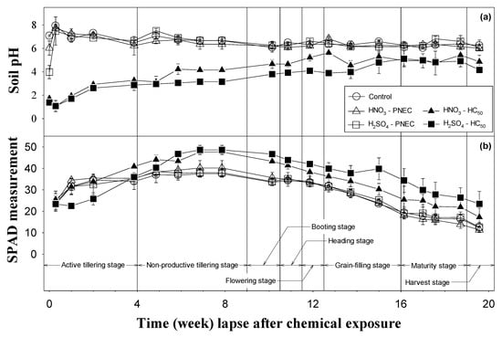 Variations in (a) pH of paddy soils and (b) chlorophyll content of rice (Oryza sativa) leaves in the four different treatments (HNO3-predicted no-effect concentration (PNEC), HNO3-hazardous concentration for 50% of species (HC50), H2SO4-PNEC, and H2SO4-HC50) during the 20-week experimental period. Data of the control are also shown for comparison. Growth stage of rice during the experimental is also shown along the x-axis.