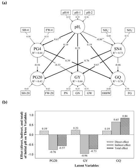 Result of partial least squares path modeling (PLS-PM). (a) Unidirectional cause–effect between six latent variables are shown as an arrow with path coefficients on it (solid and dotted arrows denote positive and negative effects, respectively). The value above the arrow in the outer model represents the weight of the measured variable. The number of asterisks indicates the significance level (** p < 0.01). R2 indicates the determination coefficient of each latent variable in the inner model. (b) Direct, indirect, and total effects of initial paddy soil pH (pHi) on three latent variables related to rice growth and productivity (PG20, GY, and GQ).