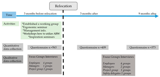 This intervention study uses a prospective design to follow the implementation of ABWs [22]. Qualitative and quantitative data were collected in 2018 and 2019 using questionnaires administered before relocation, 3 months and 9 months after relocation. Focus group interviews were conducted with employees, a working group, safety delegates and managers before and after the relocation. All participants signed an informed consent form prior to participation. The study was approved by the Regional Ethical Review Board in Uppsala, Sweden (Ref. No. 2015/118).