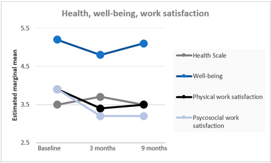 Estimated means (repeated measures ANOVA) of health, well-being (scale 1–7), and work satisfaction (scale 1–5) at baseline, 3 months, and 9 months after the implementation of activity-based workplaces (n = 246).