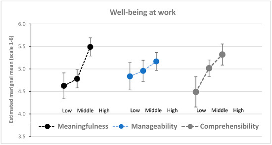 Estimated means of well-being in the workplace in groups (tertiles) with low, medium, and high meaningfulness, manageability, and comprehensibility (n = 246). Error bars indicate 95% confidence intervals.