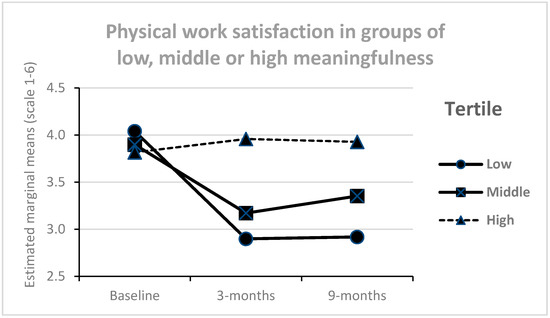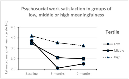 Meaningfulness interacted with time (Figure 5), showing that the reduction in physical work satisfaction over time was smaller among those with high levels of perceived meaningfulness compared to middle and low levels (F = 12.0, p < 0.001, partial eta square 0.05). A similar interaction was found on psychosocial work satisfaction (Figure 6), showing that reductions in psychosocial work satisfaction over time was smaller among those with high levels of perceived meaningfulness compared to middle and low levels (F = 9.5, p 0.002, partial eta square = 0.04). No other interaction effects were significant (p > 0.05).
