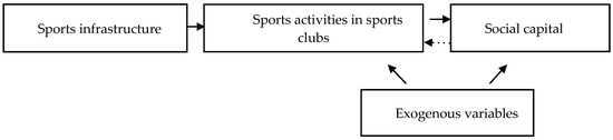As a result, subject to exclusion restriction, appraising causal relations was possible, as shown in Figure 1—i.e., it was possible to explain the changes taking place in SC as a result of the change in SA, resulting from changes in availability of sports infrastructure at the regional level, with the other exogenous variables measuring the local socio-economic development level that was controlled for.
