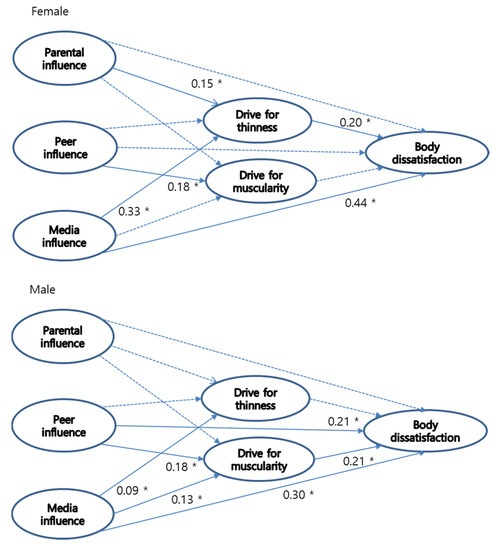 For the female group, parental and media pressures exerted significant influences on their drive for thinness and, in turn, their body dissatisfaction. Additionally, media pressures were found to have direct influences on their body dissatisfaction, thus lending support to the significant relationships between thin ideal internalization and body dissatisfaction. These findings are consistent with previous studies. Researchers have found that parental influences were positively associated with the drive for thinness among undergraduate females [43] and adolescent girls [44]. Other studies found that the media’s influence had a significant relationship with the drive for thinness among adolescent girls [45], Japanese undergraduates [46], and Australian and French female undergraduates [47]. Additionally, our findings indicate that peer pressure significantly influences the pursuit of muscularity, meaning that, besides thinness, muscle tone is a focus for young Korean women—yet this pursuit does not lead to body dissatisfaction. However, few studies have examined muscularity-related body dissatisfaction among women [48]. Our findings are in line with those of previous studies in that, when we considered the internalization of thinness and muscularity, only that of thin ideals predicted female students’ body dissatisfaction [49,50]. This suggests that, currently, young Korean women feel more insecure about being thin rather than about gaining muscularity, with becoming ultra-thin being of greater focus for their self-esteem. However, a recent Western study found that sociocultural influences (i.e., the media and one’s peers) towards thinness and muscularity idealizations contributed to increased body dissatisfaction and risky body-changing behaviors among young French women [51]. Similar findings indicate that thinness and muscularity idealizations contributed to eating disorders and substance use among German women [52].
