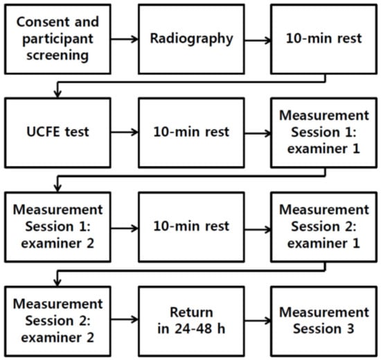 This study was designed as a cross-sectional study, and three tests were performed: (1) upper cervical flexion angle measurement using radiography, (2) the UCFE test, and (3) the UCRF test. On the first day, the participants were instructed about the study procedures before the experiment. Then, radiographs were taken. After a 10 min rest, the UCFE test was performed. Subsequently, the first session of UCRF tests was conducted by two examiners. After the measurements were taken by the two examiners, the subjects were allowed a 10 min rest before the next session. The second session was then performed in the same way as the first session. After 24–48 h, a third session was conducted by another examiner (Figure 1).