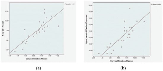 (a) Scatterplot showing the relationship between the upper cervical flexion angle using X-ray and the upper cervical rotation-flexion test (UCRF); (b) scatterplot showing the relationship between the upper cervical flexion-extension (UCFE) and UCRF tests.