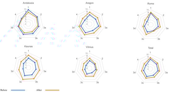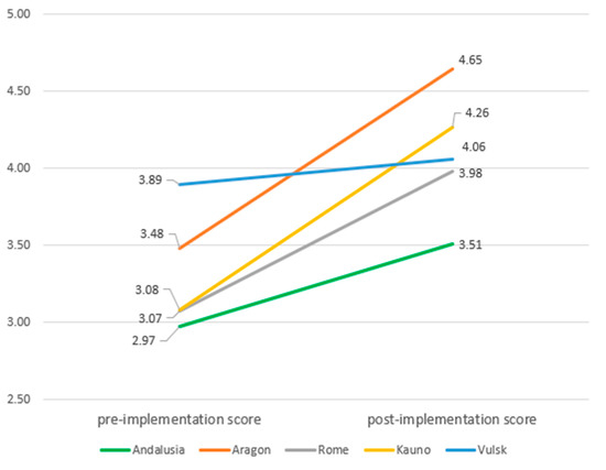 Before the implementation, members of the implementation teams completed a total of 14 ACIC surveys (two from Andalusia, three from Aragon, two from Rome, two from Kaunas, and five from Vilnius). After the implementation, 17 ACIC surveys were completed (five from Andalusia, three from Aragon, two from Rome, two from Kaunas, and five from Vilnius).