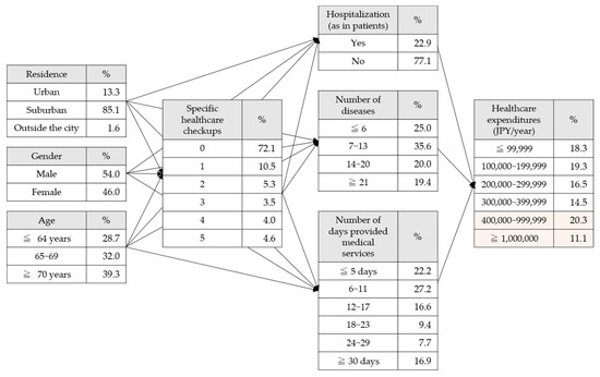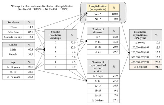 Based on this series of flow, we assigned “Attribute information” for the age, gender, and area of residence, “Health/Mibyo (the state without the disease)” for the number of specific healthcare checkups undergone, and “Outpatient and inpatient information” to record the presence or absence of hospitalization, the number of days provided medical services, and the number of diseases listed on medical insurance receipts. These were connected sequentially by arrows, which pointed to the applicable item of healthcare expenditure. In the prepared models, the observed values (i.e., the number of medical examinations undergone; the presence or absence of hospitalization; the number of diseases listed on medical insurance receipts; the number of days provided medical services) were changed and the degree of the changes in the conditional probabilities were analyzed. In this analysis, patients who paid at least 400,000 JPY (3607 USD) a year for medical expenses were considered as patients with high-cost medical expenses. This analysis focused on the changes in the percentage of patients with high-cost medical expenses. The criterion of 400,000 JPY (3607 USD) a year or more was defined as a standard amount, based on the per capita healthcare expenditures of 332,000 JPY (2994 USD).