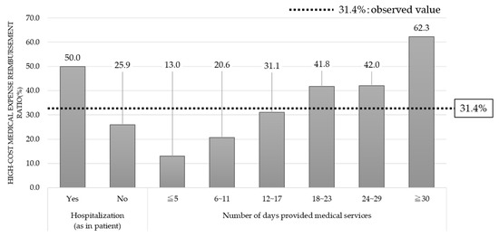 Figure 3 shows the presence or absence of hospitalization; when we hypothesized that all the patients might have been “hospitalized”, the observed values changed. The element for the presence or absence of hospitalization influenced healthcare expenditures. The conditional probabilities of healthcare expenditures were changed by the hypothesis that all the patients had been “hospitalized”. Meanwhile, there was not a significant change in the data of the elements affecting the presence or absence of hospitalization, as compared with healthcare expenditures. By this adjustment, the percentage of high-cost medical expenses for the observed value was 31.4%, while conditional probability changed to 50.0%, which indicated that the observed value exceeded the conditional probability. The same adjustment hypothesizing that 100% of the patients had been “hospitalized” was introduced to the number of days provided medical services, the number of diseases listed on medical insurance receipts, and the number of medical examinations undergone, as well as the presence or absence of hospitalization, and the changes in the percentage of high-cost medical expenses by element is shown in Figure 3 and Figure 4.