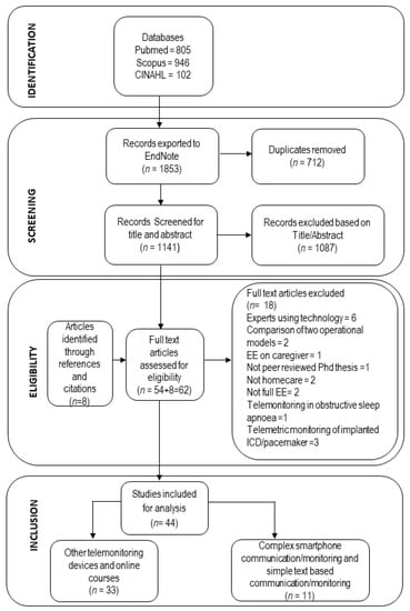 We retrieved 1853 potentially relevant studies from three databases (Pubmed, Scopus and CINAHL) and subsequently removed 712 duplicate studies. Two review team members independently screened the title and the abstract of the remaining 1141 records based on inclusion criteria, leaving 54 potential articles for the full-text reading. After reading the full text of these 54 articles, 18 articles were excluded for the following reasons: technology used by experts (six studies), not home-care (two studies), PhD thesis (one study), not focusing on older adults (three studies), not full EE (two studies), implanted ICD/pacemaker (three studies) and obstructive sleep apnea (one study). Further, eight more studies were identified through reference and citation searches.