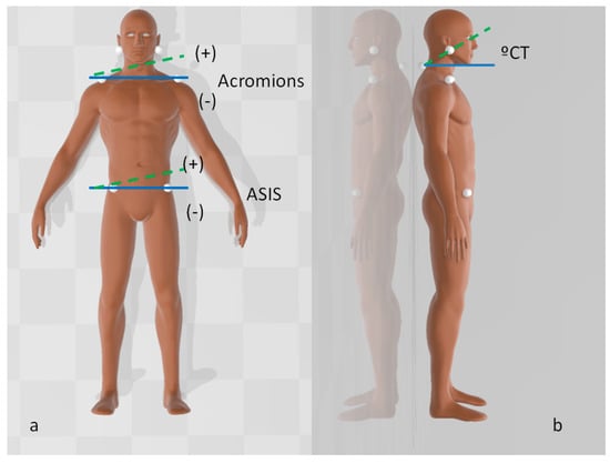 Anatomical points marked with polystyrene balls. (a) Horizontal alignment at each acromion and anterior-superior iliac spine (ASIS), as measured from the frontal view. (b) The cervical/tragus angle (°CT), as measured in the sagittal plane.