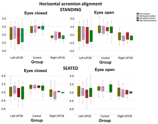 The horizontal alignment data measured in a frontal view is shown in Figure 2 and Figure 3. Horizontal acromion alignment was significantly different between the UPCB and control groups (p = 0.010) when controlled by visual input (p = 0.045), mandibular position (p = 0.211) and standing/sitting position (p = 0.255). Horizontal acromion alignment was significantly different between the left UPCB, right UPCB and control groups (p = 0.035) when controlled by visual input (p = 0.123), mandibular position (p = 0.076) and standing/sitting position (p = 0.938; Figure 2). Mandibular position had no effect based on the side of the crossbite (interaction effect p = 0.225). Pairwise comparisons reveal that the control group had a no-significant different acromial angles than right UPCB group (mean difference, 1.66°; 95%CI, −0.26–3.59°; p = 0.110) and the left UPCB group (mean difference, 1.35°; 95%CI, −0.17–2.88°; p = 0.095). No significant difference was observed for horizontal acromial alignment between the right and left UPCB groups.