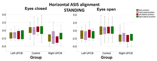 Horizontal ASIS alignment was significantly different between the UPCB and control groups (p = 0.008) when controlled by visual input (p = 0.151) and mandibular position (p = 0.577). Horizontal ASIS alignment was also significantly different between the left UPCB, right UPCB and control groups (p = 0.026). There was also no effect on horizontal alignment controlling for visual input (p = 0.199) and mandibular position (p = 0.908; Figure 3). In addition, mandibular position did not have different effects depending on the laterality of the crossbite (interaction effect p = 0.522). Pairwise comparisons revealed that control group had similar ASIS angles than the right UPCB group (mean difference, 2.02°; 95%CI, −0.06–4.09°; p = 0.060) and the left UPCB group (mean difference, 1.42°; 95%CI, −0.23–3.06°; p = 0.011). No significant difference was observed in the horizontal alignment of the ASIS between the right and left UPCB groups.