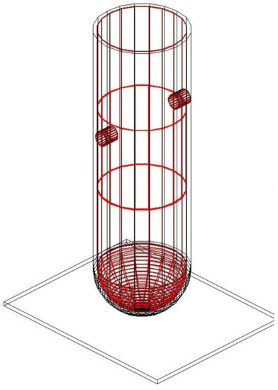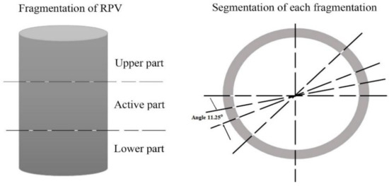 The RPV, with a total height of 14.67 m, was divided into two separate parts, consisting of a cylindrical body and a spherical cap, as shown in Figure 2. The inside diameter of the RPV and the shell thickness was 4.17 m and 0.26 m, respectively, giving it a total diameter of 4.7 m. Based on the waste drum’s specification, the cylindrical body, with a length of 12.4 m, was first divided into 18 pieces using the fragmentation process and then each of the 18 pieces was cut to 32 segments. The spherical cap part, with a total length of 2.27 m, was divided into four pieces. The top two fragments were cut into 32 segments, while the remaining two smaller fragments were cut into 10 segments. In addition, six fragmentation operations were performed for the cold and hot legs, with a height of 0.68 m for each fragment, as shown in Figure 3. The total number of pieces for the whole cutting process was 664 pieces. This procedure for cutting the RPV was based on the dimensions of the waste drum, with a height and diameter of 0.8 m and 0.57 m, respectively.