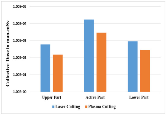 Sensitivity analysis was performed for the cutting technologies of laser and plasma for both the fragmentation and segmentation operations. The speed of plasma cutting was considered higher, at 15 mm/min, compared to 100 mm/min for the laser cutting, hence it took a longer time and led to a larger dose value received by the workers. The overall scenarios for laser cutting and plasma cutting are shown in Figure 4 and Figure 5. The occupational exposure of any worker should be controlled in order not to exceed the dose limits of 20 mSv per year averaged over five consecutive years, as recommended by the International Commission on Radiological Protection (ICRP). The values predicted in this study were relatively higher since we focused on the RPV, which was a primary component of the NPP, and thus strict measures, such as reduced time and increased shielding should be taken to protect decommissioning workers and keep the radiation exposure to the workers as low as possible.