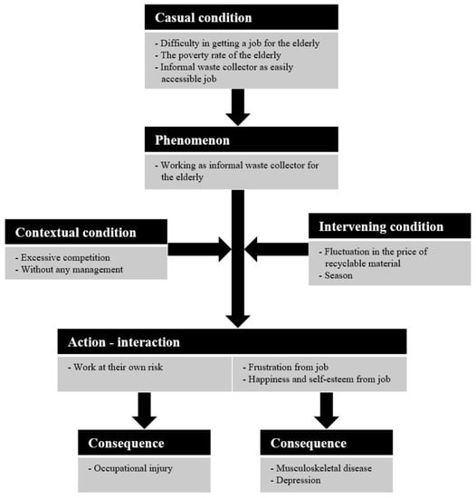 The categories corresponding to the causes of phenomena were linked to causal conditions. The causal conditions category was developed to capture the underlying causes, as perceived by participants in the three themes. “Poverty in the elderly” included participants’ descriptions of why they chose to engage in waste collecting, for example, because of family financial troubles or inadequate amounts from national pensions. When it is difficult for the elderly to find a job, it aggravates their poverty and they are induced to do work that is easily accessible.