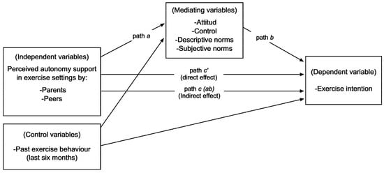 In view of the findings from previous research [,] it was hypothesized that parents’ and peers’ support for autonomy would predict exercise intention, both directly and mediated through the TPB variables. Although it is expected that the relationships between the variables may be affected by gender, given the exploratory nature of the sex-segmented analysis, no prior hypotheses were made.