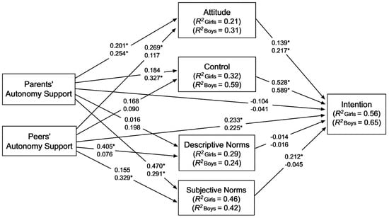 Direct effects and explained variance in the mediation model. Unstandardized regression coefficients shown were obtained by applying 20,000 bootstrapping iterations. The values in the top (bottom) row show the estimates for girls (boys). For the sake of clarity, the following values have not been included in the graphical representation: (a) the effects of the control variable (i.e., past exercise behaviour in the last six months), and (b) the covariance terms between parents’ and peers’ autonomy support. * Denotes a statistically significant regression coefficient (i.e., the 95% CI does not contain the zero value).