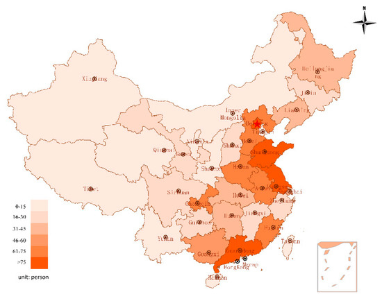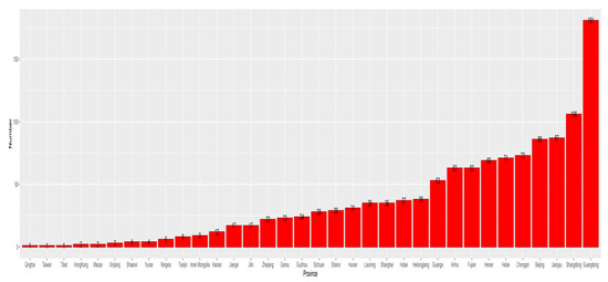 ± s) was determined to be 51.9 ± 9.12, which meant that most participants had a medium or higher level of self-efficacy. According to Shapiro Wilk test, p = 1.2333 × 10−23, which is less than 0.05, indicating that the total score data are a non normal distribution. According to the respondents’ IP addresses, most respondents were from 34 provinces, autonomous regions, and municipalities in China, with most coming from Guangdong province, and 12 respondents lived outside of China (see Figure 2). Because of the wide geographical distribution of participants, with each region represented by many participants, this study’s results are representative of all regions in China. Figure 3 maps the number of respondents for each region.