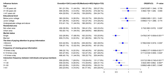 Respondents with higher self-efficacy were more likely to live in urban areas (p < 0.05) and be married (p < 0.05) and tended to spend more time paying attention to group information (p < 0.05), have a higher frequency of viewing group information (p < 0.05), and have a higher frequency of interaction with group members (p < 0.05).
