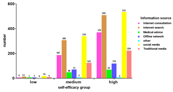 A cross-tab analysis of different levels of self-efficacy was conducted and the results are shown in Figure 5. The sources of information used by respondents were analyzed, with each source scored according to the number and percentage of respondents using it, in total and for each self-efficacy group. As indicated in Figure 5, the main sources of diabetes information for respondents of all self-efficacy levels were social media; 76.0% (19/25), 70.0% (338/483), and 73.0% (535/733) of respondents with low, medium, and high self-efficacy used this source, respectively. For all groups, advice from medical staff was rarely used as an information source; 12.0% (3/25), 9.9% (48/483), and 9.5% (70/733) of respondents with low, medium, and high self-efficacy used this source, respectively. The main sources of diabetes knowledge for respondents with low and medium self-efficacy were search engines and social media; those for respondents with high self-efficacy were search engines, social media, network platforms for professional advice, and mobile apps. Other sources of diabetes knowledge included scripture, magazines, and e-books.